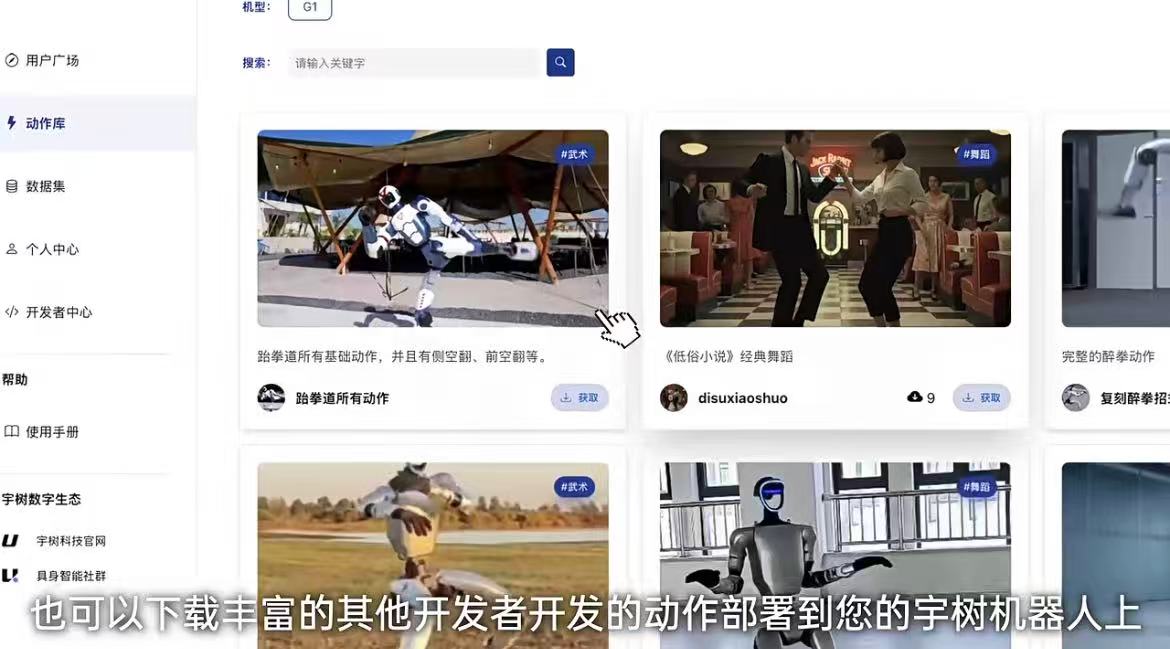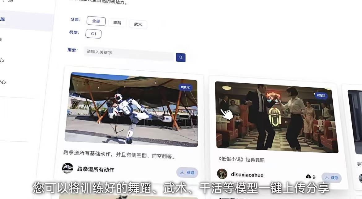根据官方演示,用户可以将训练好的舞蹈、武术、干活等模型一键上传分享,也可以下载其他开发者开发的动作部署到机器人上。用户无须掌握编程技能,通过App连接机器人,即可像安装普通应用一样,从云端获取并部署复杂的运动控制算法。